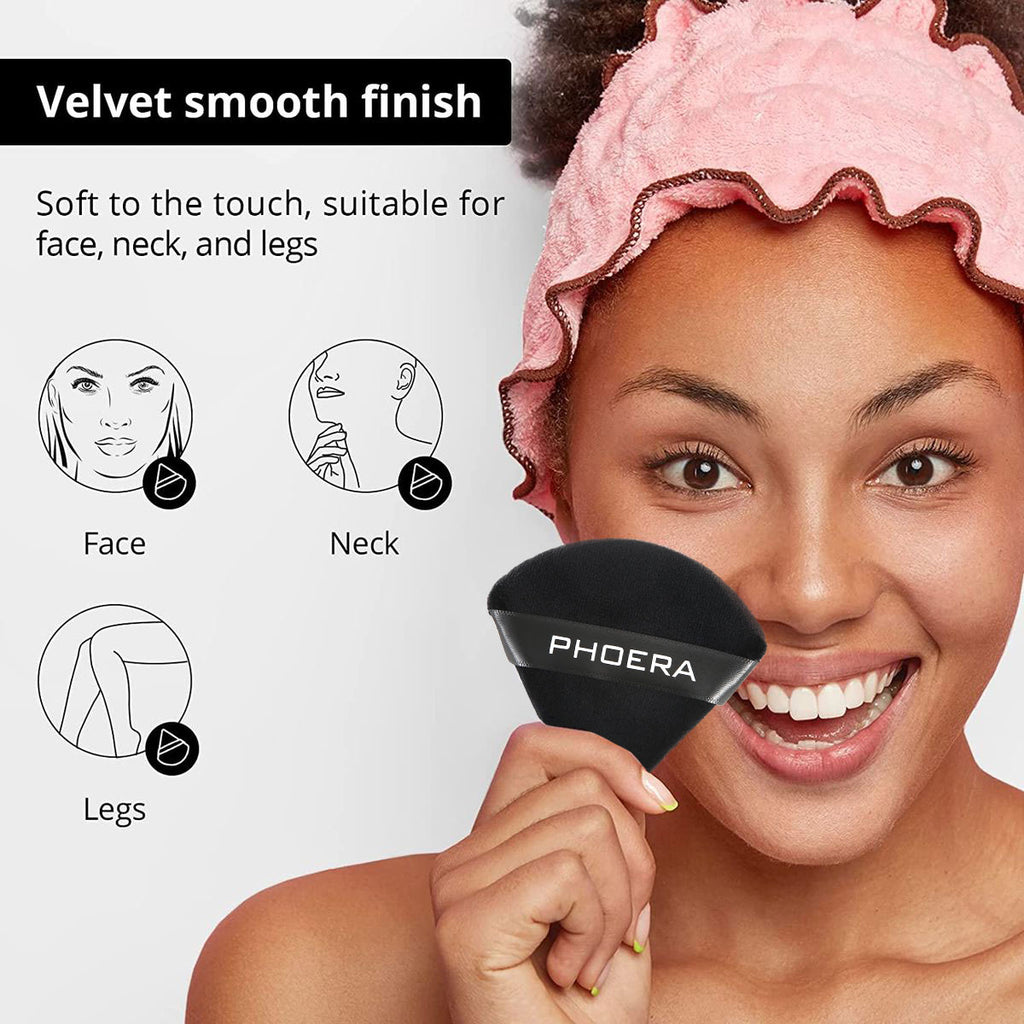 Phoera's soft triangle puff is easy to hold and allows for a smooth makeup application on the face, neck and even the legs!